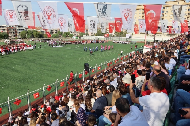 Hükümet Konağı’ndaki törenin ardından Bornova Şehir Stadı’ndaki kutlama programına geçildi. Vatandaşların yoğun ilgi gösterdiği törende Türkiye ve Dünya Şampiyonu Milli cimnastikçiler gösterileriyle büyük heyecan yaşattı. Öğrencilerin günün anlam ve önemini anlatan şiirler okuduğu törende Cumhuriyet Kupası Kros Yarışması’nda dereceye girenlere ödülleri verildi. Bornova’da göreve yapan beden eğitimi öğretmenlerinin zeybek gösterisi de büyük ilgiyle izlendi. Bornova’daki okulların yer aldığı resmi geçit töreni ile son bulan stadyum kutlamalarında dev Türk Bayrağı açıldı.