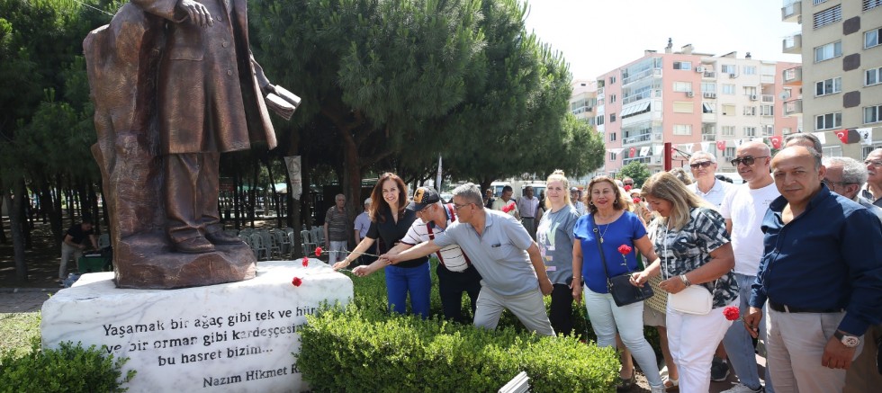 Nazım Hikmet Heykeli’ne kırmızı karanfiller bırakan Karşıyaka Belediye Başkanı Yıldız Ünsal “Böylesine özel ve ölümsüz değerleri olan bir halk, aydınlık ve güzel günleri mutlaka yeniden yakalayacak ve yarınlarına armağan edecektir. Bu uğurda çalışmaktan asla vazgeçmeyeceğiz. Bir ağaç gibi tek ve hür… Ve bir orman gibi kardeşçesine yaşamayı mutlaka öğreneceğiz. Kaybettiğimiz değerleri özlem ve saygıyla anıyorum” diye konuştu.