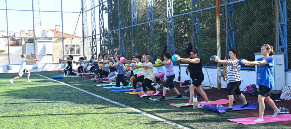 Karabağlar Belediyesi, kadınlar için haftada iki gün antrenör eşliğinde Yeşilyurt Halı Sahası’nda spor yapma imkanı sunuyor.