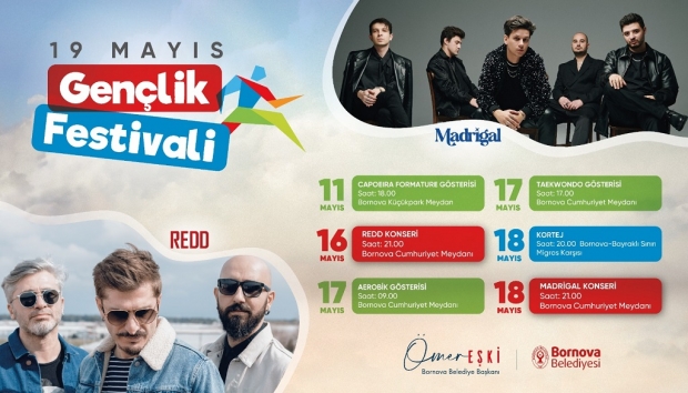 11-18 Mayıs tarihleri arasında gerçekleşecek Gençlik Festivali Küçükpark Meydanı’ndaki Capoeira Gösterisi ile başlayacak. 16 Mayıs akşamı sevilen Rock Grubu Redd, Bornova Cumhuriyet Meydanı’nda hayranları ile buluşacak. Aynı meydan 17 Mayıs’ta aerobik ve taekwondo gösterilerine sahne olacak. Festivalin finali 18 Mayıs akşamı yapılacak. Bornova-Bayraklı sınırından başlayacak kortej ile coşku Bornova sokaklarına taşınacak, Mustafa Kemal Caddesi kırmızı-beyaz renklere boyanacak. Kortejin sona erdiği Bornova Cumhuriyet Meydanı’nda Alternatif Rock Müzik Grubu Madrigal’ın konseri gerçekleşecek.