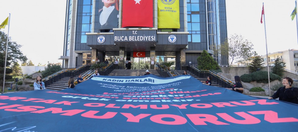 Buca Belediyesi ana hizmet binası önünde ise “Sessizlik, şiddete ortak olmaktır. Görmezden gelmek, şiddete ortak olmaktır. Duymazdan gelmek, şiddete ortak olmaktır. Ortak olmuyoruz. Susmuyoruz" yazılı dev pankart açıldı.