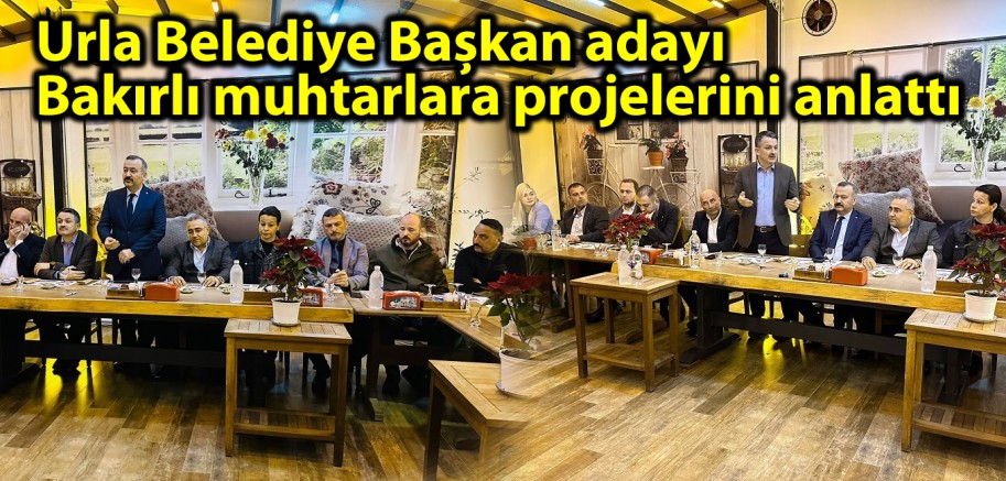 Cumhur İttifakı Urla Belediye Başkan Adayı Tarkan Bakırlı, Urla muhtarları ile toplantıda bir araya geldi. Urla’nın Tüm muhtarlarının katılım sağladığı toplantı yaklaşık 4 saat sürdü. Toplantıya önceki dönem Tarım ve Orman Bakanı Bekir Pakdemirli’de katılım sağlayarak, istek ve taleplerin yakından takipçisi olacağını söyledi.