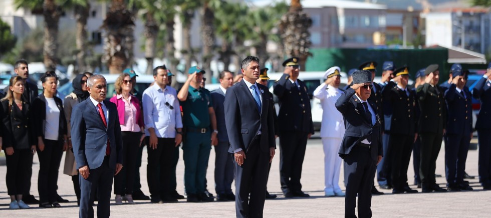 Törende, Aliağa Kaymakamı Zekeriya Güney, Aliağa Belediye Başkanı Serkan Acar, Garnizon Komutanı Albay Faruk Altun ve Gaziler adına Kıbrıs Gazisi İslam Doğan Kılıç Atatürk Anıtı’na çelenk sundu.