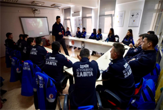 İzmir Büyükşehir Belediyesi zabıta ekipleri, yangın riskine karşı alınması gereken önlemler ile olası yangınlara karşı doğru müdahale tekniklerine yönelik eğitimden geçirildi.