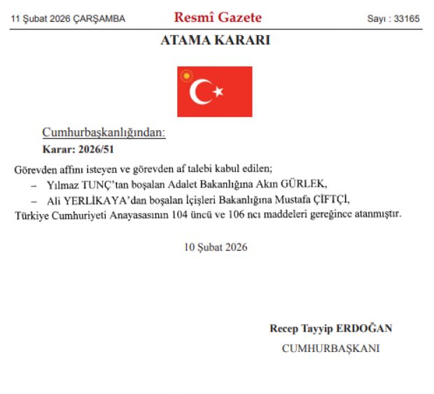 Cumhurbaşkanı Recep Tayyip Erdoğan’ın imzasıyla yayımlanan atama kararlarıyla Cumhurbaşkanlığı Kabinesi’nde dikkat çeken görev değişiklikleri yaşandı. Resmi Gazete’de duyurulan kararlara göre Adalet Bakanlığı görevine Akın Gürlek, İçişleri Bakanlığı görevine ise Mustafa Çiftçi getirildi.