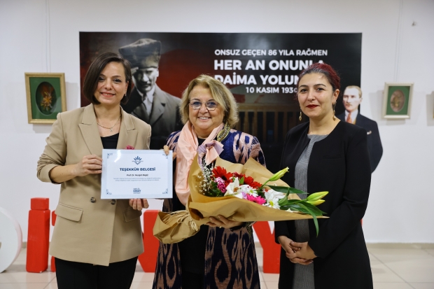 Açılış sonunda Başkan Helil Kınay, Prof. Dr. Begiç’e çiçek ve teşekkür belgesi takdim ederken, Begiç de Başkan Kınay’a ipek kozasından yapılmış özel bir broş hediye etti.