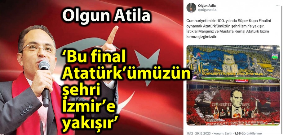Suudi Arabistan'ın başkenti Riyad’da bu akşam oynanması beklenen Galatasaray-Fenerbahçe 2023 Turkcell Süper Kupa finalinde Yurtta Sulh Cihanda Sulh pankartı ve Atatürk tişörtlerine izin verilmemesi nedeniyle iptal edilen mücadelenin ardından, final maçının İzmir Atatürk Stadyumu’nda oynanması yönünde bir çağrı zinciri oluşturuldu. İzmir Büyükşehir Belediye Başkan Aday Adayı Olgun Atila, sosyal medya hesabından henüz maç iptal edilmeden saatler önce yaptığı çağrı ile mücadelenin İzmir Atatürk Stadı’nda oynanması çağrısında bulunmuştu